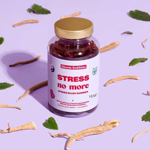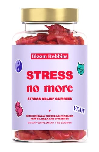 Bloom Robbins STRESS no more gummies are tasty forest fruit-flavored supplements designed to support mental well-being and stress reduction. They contain Ashwagandha for sleep support and antioxidant benefits, lemon balm for relaxation and positive mood, and Vitamin B6 for nervous system function and fatigue reduction. Made from fruit pectin, they are gluten-free, lactose-free, and contain no artificial flavors. Each pack contains 60 gummies.