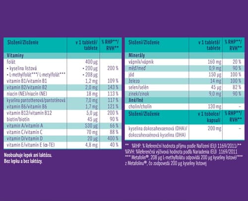 Složení (tablety): fosforečnan vápenatý, cholin bitartarát, plnidlo: mikrokrystalická celulóza, kalcium-L-askorbát, bisglycinát železnatý, leštící látka: hydroxypropylmethylcelulóza, polyvinylalkohol, hydroxypropylcelulóza, polyethylenglykol, mastek, plnidlo: zesíťovaná sodná sůl karboxymethylcelulózy, protispékavá látka: hydrogenfosforečnan vápenytý, hořečnaté soli mastných kyselin, nikotinamid, škrob, maltodextrin, barvivo: uhličitan vápenatý, červený, oxid zinečnatý, DL-a-tokoferol-acetát, kalcium-D-panthotenát, glukózový sirup, emulgátor, arabská guma, sacharóza, modifikovaný škrob, pyridoxin-hydrochlorid, síran měďnatý, riboflavin, thamin-mononitrát, retinyl-acetát, L-methylfolát vápenatý (Metafolin®), kyselina pteroylmonoglutamová, jodid draselný, selenan sodný, D-biotin, cholekalciferol, kyanokobalamin. Složení (tobolky): rybí tuk bohatý na DHA, želatina (hovězí), rafinovaný slunečnicový olej, zvlhčující látka, glycerol, antioxidant: extrakt bohatý na tokoferol. Informace pro alergiky: obsahuje sóju a ryby. Složení v 1 tabletě: folát 400 mcg (200 % RHP*) - kyselina listová 200 µg, L-methylfolát** 208 µg, vitamín B1 - 1,2 mg (109 % RHP*), vitamín B2 - 2 mg (143 % RHP*), niacin (NE) -18 mg (113 % RHP*), kyselina pantothenová - 7 mg (117 % RHP*), vitamín B6 - 1,7 mg (121 % RHP*), vitamín B12 - 5 µg (200 % RHP*), biotin - 45 µg (90 % RHP*), vitamín A - 530 µg (66 % RHP*), vitamín C - 70 mg (88 % RHP*), vitamín D3 - 20 µg (400 % RHP*), vitamín E(α-TE) - 4,8 mg (40 % RHP*), vápník 160 mg (20 % RHP*), měď - 0,9 mg (90 % RHP*), jód -150 µg (100 % RHP*), železo - 14 mg (100 % RHP*), selen - 45 µg (82 % RHP*). Složení v 1 tobolce: kyselina dokosahexaenová (DHA) - 200 mg (RHP* není stanovena). *RHP - referenční hodnota příjmu. ** Metafolin® - 208 µg L-methylfolátu, což odpovídá 200 µg kyseliny listové.