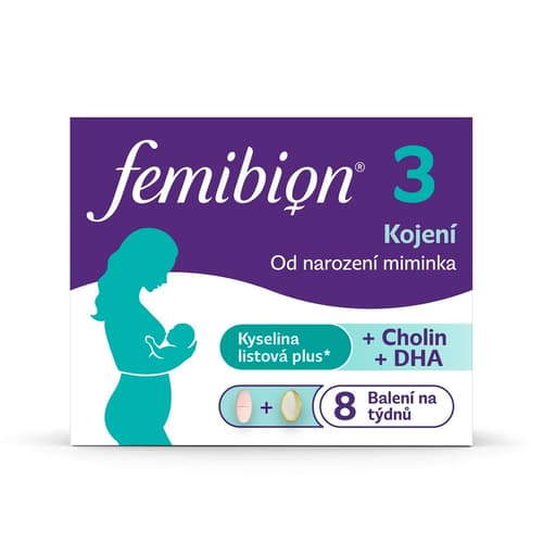 Doplněk stravy. Femibion 3 Kojení je speciálně vyvinut pro podporu maminky a dítěte po porodu. Fáze kojení je velmi výjimečná, protože svému děťátku předáváte prostřednictvím mateřského mléka důležité živiny. Během období kojení se zvyšuje potřeba některých živin, např. zvláštní pozornost by se měla věnovat dostatečnému příjmu omega-3 mastné kyseliny DHA. Příjem DHA (omega-3 polynenasycené mastné kyseliny) v období kojení přispívá k normálnímu vývoji mozku a zraku vašeho kojeného dítěte. Příznivého účinku DHA je dosaženo doplňkovým denním příjmem 200 mg DHA navíc k doporučenému dennímu příjmu omega-3 mastných kyselin pro dospělé, tj. 250 mg DHA a EPA. Femibion 3 poskytuje pečlivě vybrané látky, z nichž především DHA vás oba během tohoto období podporuje jako doplněk k pestré stravě. Poskytuje vám také folát, cholin, vitamin D, vápník, vitamin A a železo, které doplní vaši pestrou stravu v tomto období. Železo pomáhá snižovat únavu a vápník přispívá k normálnímu vývoji kostí. Vitamin D přispívá ke správnému vstřebávání a využití vápníku, k udržení stavu kostí a zubů a k normální funkci imunitního systému. Nepřekračujte doporučené denní dávkování. Uchovávejte mimo dosah dětí. Doplňky stravy nejsou náhradou pestré a vyvážené stravy. Balení obsahuje: 56 tablet a 56 tobolek. Hmotnost 110,3 g.