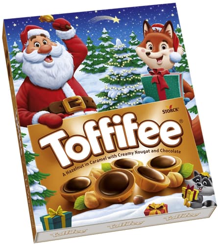 Toffifee, celé jádro lískového oříšku v karamelu s nugátovým krémem a kapkou hořké čokolády na povrchu ve vánoční edici.