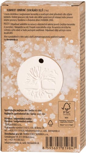 - Keramický odpařovač esenciálních olejů: umístěte na nesavý a dostatečně odolný povrch (nejlépe keramika či porcelán). Nakapejte na něj tři až pět kapek vybraného esenciálního oleje. Keramická destička ho vstřebá a jeho vůně se bude postupně uvolňovat. Šíření vůně podpoříte, pokud otvorem v destičce provléknete provázek či stužku a zavěsíte ji na místo, kde proudí vzduch (okno, dveře, topení, ventilátor).