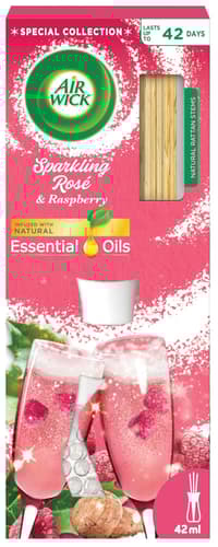 Objevte jedinečnou vůni svěžích tónů růžového sektu obohaceného o šťavnatou sladkost malin. Vonné tyčinky Air Wick využívají přírodní ratanová stébla k jemnému uvolňování vůně. Vytvořte si doma hřejivou atmosféru díky vůni s přírodními esenciálními oleji a elegantnímu designu.