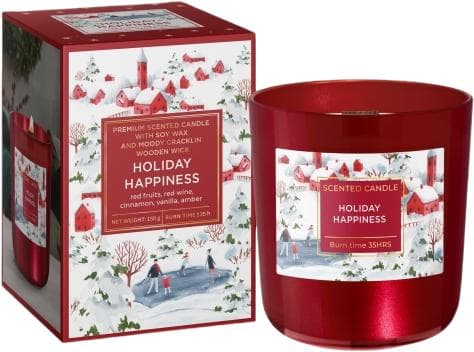Vonná svíčka ze sójového vosku a praskajícím dřevěným knotem a vůní červeného ovoce, červeného vína, skořice, vanilky a pryskyřice.
