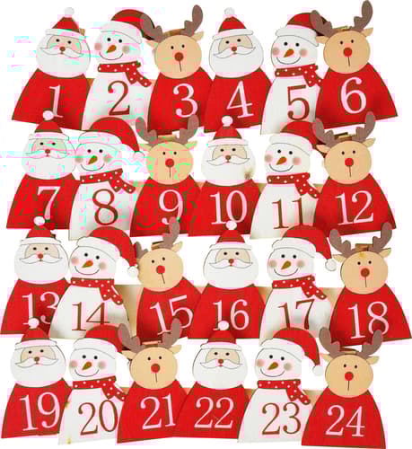 Sada 24 dřevěných kolíčků s figurkami a čísly je ideální pro vytvoření vlastního adventního kalendáře. Jednotlivé figurky na sobě mají motivy Santa Clause, soba Rudolfa nebo sněhuláka.