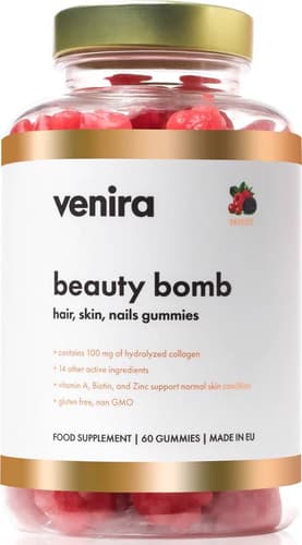 Transform your beauty routine into a sweet treat with Venira Beauty bomb gummies. These delicious forest berries flavored natural food supplements are perfect for beautiful skin, strong nails, and healthy hair. Each daily dose contains 100mg of hydrolyzed collagen, hyaluronic acid, and biotin. They are also gluten-free, lactose-free, and GMO-free. This pack of 60 pieces provides a 30-day supply.