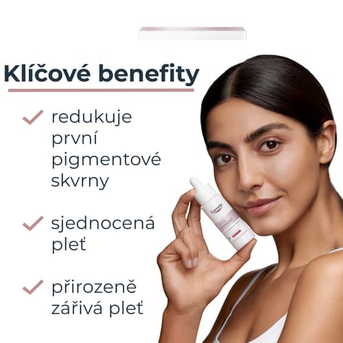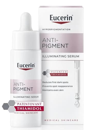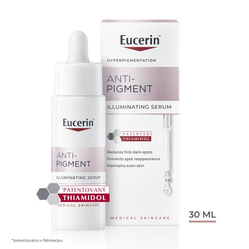 Eucerin Antipigment Rozjasňující sérum pro sjednocený tón a hladší, přirozeně zářivý vzhled pleti. Účinně redukuje pigmentové skvrny a brání tvorbě nových. Toto rozjasňující sérum vyvinuté pro dokonalou zářivost pleti na základě medicínského přístupu k péči o pleť využívá patentovanou účinnou látku značky Eucerin - thiamidol ®. Thiamidol ® redukuje pigmentové skvrny a brání jejich opakovanému výskytu přímo v místě jejich vzniku snížením tvorby melaninu při pravidelném používání. Kyselina hyaluronová a glycerin společně zajištují hladší a vláčnější vzhled, vyplňují pleť díky intenzivní hydrataci pro její vetší zářivost. Ultralehká konzistence díky technologii Crystal Technology je vhodná pro všechny typy pleti a lze ji začlenit do jakékoliv pravidelné péče o pleť. Rychle se vstřebává a zanechává na pleti hladký pocit. Pleť získává sjednocený tón a přirozeně zářivý vzhled, první viditelné výsledky již po 2 týdnech. Klinické testy potvrzují jeho vysokou účinnost a bezpečnost. Vhodné pro všechny typy pleti. Balení obsahuje 30 ml.
