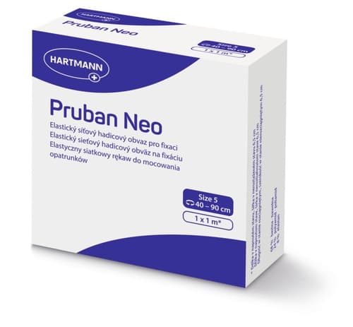 Zdravotnický prostředek. Pruban Neo je hadicový, vysoce elastický síťový obvaz se širokými oky, který je určen k rychlé fixaci krytí ran. Obvaz zajišťuje pevné fixování ran i při pohybu, přizpůsobuje se tvaru těla - neškrtí, netvoří záhyby, nevytahuje se. Dobře se snáší s pokožkou a při výměně krytí se nemusí odstraňovat. Obvaz je možno vyvářet a sterilizovat, nepoškozují jej tuky, masti ani pot. Výhody produktu: Vysoce elastický bezešvý obvaz s oky, určený k rychlé fixaci krytí ran. Vyroben z běleného úpletu z bavlny a elastických vláken s PA přízí. Neobsahuje latex. Rozměr: 40 - 90 cm × 1 m*. Velikost č. 5 - vhodná pro lokty, kolena. * Délka v napnutém stavu, šířka v neroztaženém stavu 6,5 cm. Balení obsahuje 1 ks.