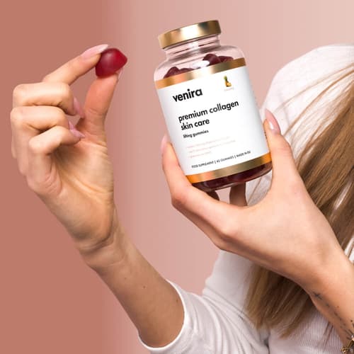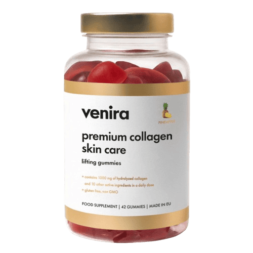 Doplněk stravy. Premium collagen skin care značky Venira je doplněk stravy ve formě gumových bonbónů s ananasovou příchutí. Tento produkt obsahuje pečlivě vybraných 11 aktivních látek, přičemž v popředí stojí 1000 mg hydrolyzovaného hovězího kolagenu. Gumové bonbóny jsou vhodné především pro ženy i muže starší 25 let, kdy pleť začíná přirozeně ztrácet kolagen a elastin, dva klíčové proteiny zajišťující její pevnost a pružnost. Každý gumový bonbon obsahuje 1000 mg hydrolyzovaného hovězího kolagenu a 25 mg kyseliny hyaluronové. Dále obsahuje 800 mcg vitaminu A (retinol), který přispívá k udržení normálního stavu pokožky a sliznic, vitamin E pro ochranu buněk před oxidativním stresem a minerály zinek a selen. Složení je obohaceno o koenzym Q10. Tento doplněk stravy je bez lepku, laktózy a GMO, a má příchuť ananasu. Kúra trvá 21 dní. Nepřekračujte doporučené denní dávkování. Uchovávejte mimo dosah dětí. Doplňky stravy nejsou náhradou pestré a vyvážené stravy. Balení obsahuje 42 gumových bonbónů. Hmotnost obsahu: 189 g.