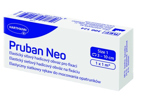 Zdravotnický prostředek. Pruban Neo je hadicový, vysoce elastický síťový obvaz se širokými oky, který je určen k rychlé fixaci krytí ran. Obvaz zajišťuje pevné fixování ran i při pohybu, přizpůsobuje se tvaru těla - neškrtí, netvoří záhyby, nevytahuje se. Dobře se snáší s pokožkou a při výměně krytí se nemusí odstraňovat. Obvaz je možno vyvářet a sterilizovat, nepoškozují jej tuky, masti ani pot. Výhody produktu: Vysoce elastický bezešvý obvaz s oky, určený k rychlé fixaci krytí ran. Vyroben z běleného úpletu z bavlny a elastických vláken s PA přízí. Neobsahuje latex. Rozměr: 3 - 10 cm × 1 m*. Velikost č. 1: vhodná pro jeden a více prstů. * Délka v napnutém stavu, šířka v neroztaženém stavu 1,5 cm. Balení obsahuje 1 ks.