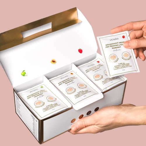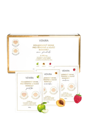 Doplněk stravy. Premium kolagenový drink značky Venira je doplněk stravy ve formě sypkého prášku, který je speciálně určen pro těhotné a kojící maminky. Tento jeden z nejsilnějších kolagenových drinků na trhu obsahuje 8 500 mg 100% bioaktivního hydrolyzovaného kolagenu v každé denní dávce. Kromě kolagenu je doplněn o dalších 11 aktivních látek: vitamín C, zinek, hořčík, vitamíny B1, B2, B3, B5, B6, biotin, kyselinu listovou a vitamín B12. Kyselina listová přispívá k normální krvetvorbě, správné funkci imunitního systému, snižuje únavu a vyčerpání a podílí se na dělení buněk. Je důležitá pro normální vývoj plodu a růst zárodečných tkání během těhotenství. Vitamin B12 pomáhá snižovat únavu a vyčerpání, podporuje imunitní systém a tvorbu červených krvinek. Vitamin C napomáhá vstřebávání a produkci kolagenu v těle. Zároveň přispívá k posílení imunity, ochraně buněk před oxidativním stresem a zmírnění únavy. Zinek přispívá k udržení normálního stavu nehtů, vlasů a pokožky a působí jako antioxidant, chránící buňky před vnějšími vlivy. Vitamin B2 (riboflavin) přispívá k ochraně buněk před oxidativním stresem a podílí se na udržení zdravé pokožky a zraku. Tento kolagenový drink je bez cukru, lepku a laktózy, slazený stévií, a je dostupný v mixu příchutí: 10x meruňka, 10x malina, 10x jablko. Nepřekračujte doporučené denní dávkování. Uchovávejte mimo dosah dětí. Doplňky stravy nejsou náhradou pestré a vyvážené stravy. Balení obsahuje 30 sáčků . Hmotnost obsahu 324 g.