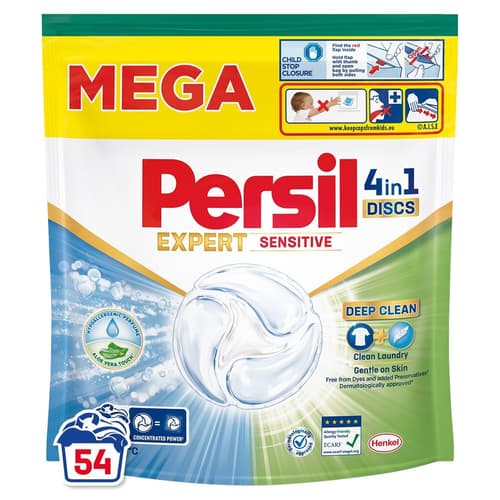 Výkonné, čtyřkomorové gelové kapsle na praní Persil Expert Sensitive kombinují účinnost přírodního mýdla s vylepšenou úrovní péče a ochrany citlivé pokožky. Jsou tak ideálním pracím prostředkem pro děti nebo alergiky. Kapsle mají dermatologicky testované složení, které bylo vyvinuto s hypoalergenní parfemací a obohaceno o známou složku zklidňující pokožku aloe vera.