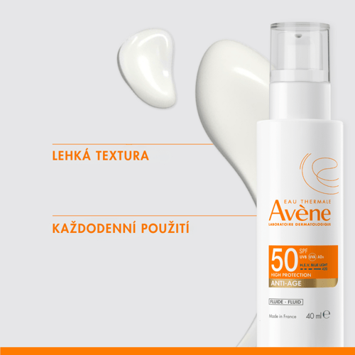 AVENE Anti-age fluid SPF 50 poskytuje vysokou ochranu proti UVB, UVA a modrému světlu HEV. Tento lehký fluid nejen chrání vaši pokožku před škodlivými slunečními paprsky, ale také předchází fotostárnutí a zlepšuje pevnost pokožky. Díky hydratačním vlastnostem pomáhá redukovat vrásky způsobené slunečním zářením a je ideální jako podklad pod make-up. Je bez parfemace a vhodný i pro citlivou pokožku. Vlastnosti: Vysoká ochrana proti UVB, UVA a modrému světlu HEV. Hydratuje a redukuje vrásky způsobené slunečním zářením. Lehká textura je ideální jako podklad pod make-up. Bez parfemace a vhodný pro citlivou pokožku. Balení obsahuje 40 ml.