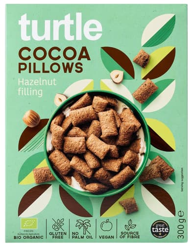 Turtle BIO Polštářky s kakaem a lískooříškovou náplní jsou organické cereálie vyrobené z kvalitních surovin s důrazem na zdravý a udržitelný přístup k výživě. Každý křupavý polštářek je plněný jemnou náplní z lískových oříšků a kakaa, která dodává výrobku bohatou a přirozeně sladkou chuť. Produkt je vyroben bez palmového oleje, obsahuje méně cukru než běžné sladké cereálie a je ideální i pro vegany.