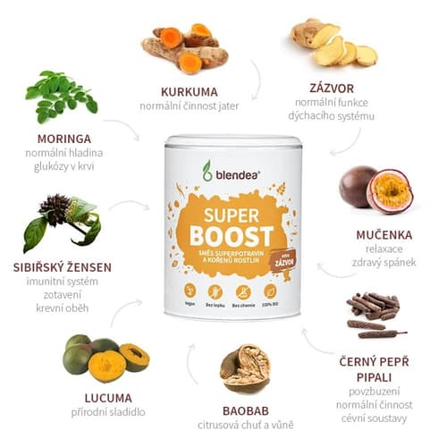 Doplněk stravy. Blendea Super Boost extra zázvor BIO je doplněk stravy ve formě instantního nápoje. Obsahuje celkem 8 superpotravin (ženšen, moringu, zázvor, kurkumu, mučenku, černý pepř, lucumu a baobab). Neobsahuje kofein, lepek, je vhodný pro vegany. Kurkuma podporuje normální trávení a správnou činnost jater. Mučenka neboli maracuje má příznivý vliv na spánek a relaxaci. Moringa olejodárná přispívá k udržení správné hladiny glukózy v krvi. Zázvor lékařský podporuje přirozenou obranyschopnost a imunitní systém. Sibiřský ženšen podporuje kognitivní a duševní výkonost, přirozenou obranyschopnost a imunitní systém. Nepřekračujte doporučené denní dávkování. Uchovávejte mimo dosah dětí. Doplňky stravy nejsou náhradou pestré a vyvážené stravy. Balení obsahuje 100 g.