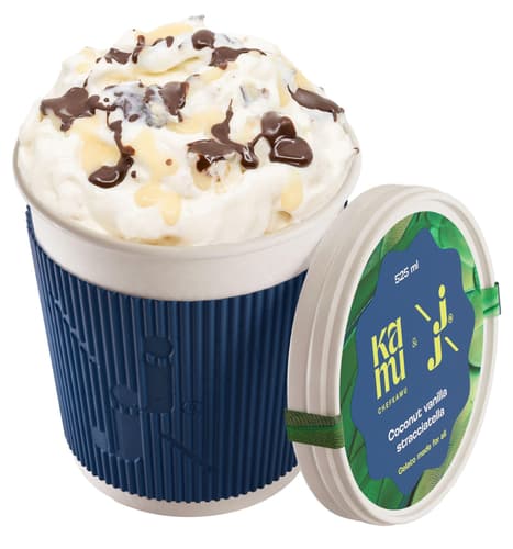 Řemeslná zmrzlina v kelímku s příchutí kokosu, vanilky a stracciatelly.