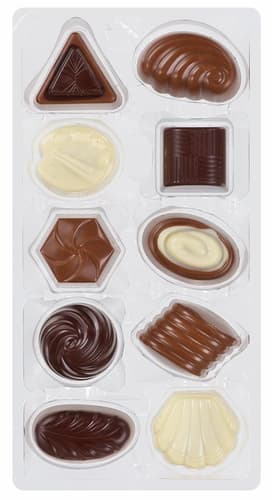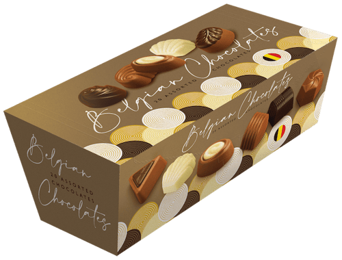 A unique blend of Belgian pralines in a golden paper wrapper, made from milk, dark, and white chocolate. With hazelnuts, caramel, orange, and many other ingredients.