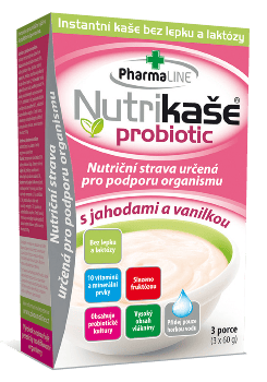 Nutrikaše probiotic jahoda a vanilka je chutná, snadno připravitelná instantní rýžová kaše s kousky lyofilizovaných jahod, bez lepku a laktózy. Vhodná pro jedince s výživovým omezením při nesnášenlivosti lepku, intoleranci na laktózu, zájemce o racionální stravování, rekonvalescenty nebo jako ekonomická alternativa ke snídani, večeři nebo svačině. Obsahuje 10 vitaminů a minerální prvky. Biotin, mangan, niacin, vitamin C, B12, B6, B2, zinek a železo přispívají k normálnímu energetickému metabolismu. Vitaminy B12, B6, C a železo podporují běžnou funkci imunitního systému a přispívají k normální činnosti nervové soustavy. Mangan, vitamin C a E přispívají k ochraně buněk před oxidativním stresem. Jedna porce obsahuje 5 miliard probiotických baktérií Bacillus coagulans. K přislazení je používán ovocný cukr - monosacharid fruktóza. Fruktóza má příznivější glykemický index a běžně se vyskytuje ve zralém ovoci. Pro podporu trávení jsou obohaceny o vysoký obsah kvalitní vlákniny z čekanky. Jedna porce průměrně obsahuje 6 % vlákniny inulin. Balení obsahuje 180 g (3x60 g).