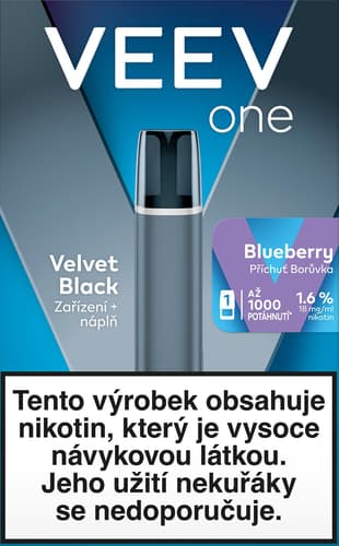 VEEV ONE přináší cenově dostupné a intuitivní zařízení, které poskytuje maximální požitek z vapingu. Inteligentní technologie zajistí konzistentní chuť při každém potáhnutí a dlouhotrvající požitek (až 1 000* potáhnutí v 1 náplni). Baterie se nabije za méně než 45 minut. Žádné čištění a doplňování e-liquidu. Zařízení VEEV ONE se používá jen s náplněmi VEEV ONE (součástí balení je náplň s příchutí Blueberry).