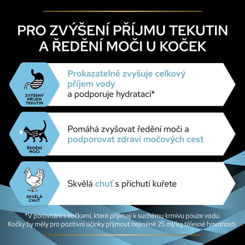 Doplňkové krmivo Pro Plan pro podporu hydratace u dospělých koček. Prokazatelně zvyšuje celkový příjem tekutin a podporuje hydrataci. Tato živinami obohacená receptura s příchutí kuřete napomáhá ředění moči a podporuje zdraví močových cest u koček.