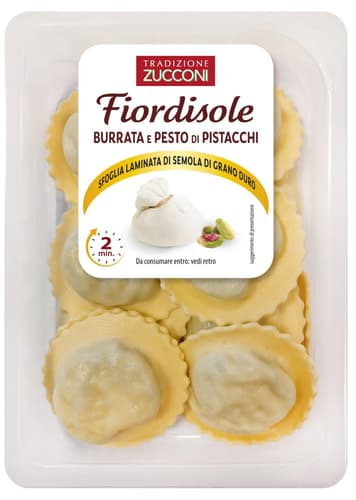 Náplň 50 % [ricotta (syrovátka, mléko), burrata 17,3 % (mléko, smetana, jedlá sůl, syřidlo, regulátor kyselosti: kyselina mléčná), pistácie 10 %, sýr Grana Padano DOP 8 % (mléko, jedlá sůl, syřidlo, konzervant: vaječný lysozym), slunečnicový olej, syrovátka, rehydratované brambory (brambory, emulgátory: mono–a diglyceridy mastných kyselin), jedlá sůl].
