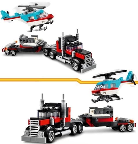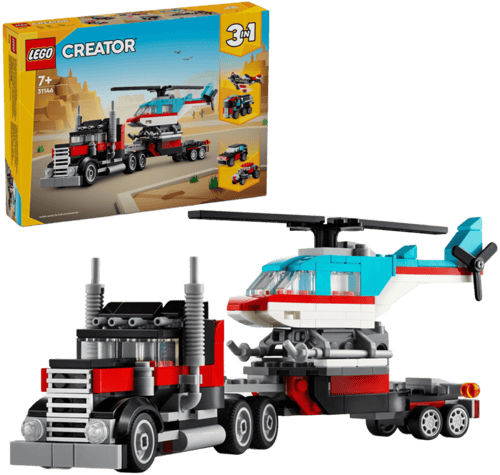 Děti od sedmi let se se stavebnicí LEGO® Creator 3 v 1 Náklaďák s plochou korbou a helikoptéra pustí do akčního hraní. Sada se skládá z 270 dílků, ze kterých si malí stavitelé postaví parádní náklaďák s otáčecími koly a korbou, na které přistane helikoptéra LEGO s pohyblivou vrtulí. Malí stavitelé si s touto stavebnicí z řady LEGO® Creator 3 v 1 poskládají hned tři různé dvojice modelů. Nejprve si postaví náklaďák s plochou korbou a helikoptéru, pak modely přestaví na vrtulové letadlo a náklaďák s palivem s otáčecími koly a pak se vydají na závody s modely hot rodu a SUV – nebo si postaví vlastní originální vozidla. Se stavebnicemi 3 v 1 je čekají hodiny zábavy a postaví si s nimi modely inspirované jejich zájmy, včetně superrychlých vozidel, úžasných zvířat a propracovaných městských scén.