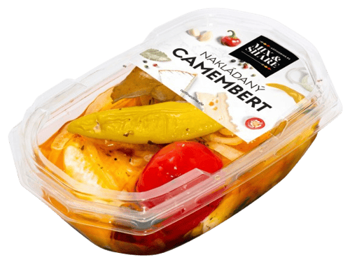 Set tapas značky Mix&Share, který kombinuje sýr camembert nakládaný v řepkovém oleji s červenými a zelenými feferonkami a marinovanými rajčaty.
