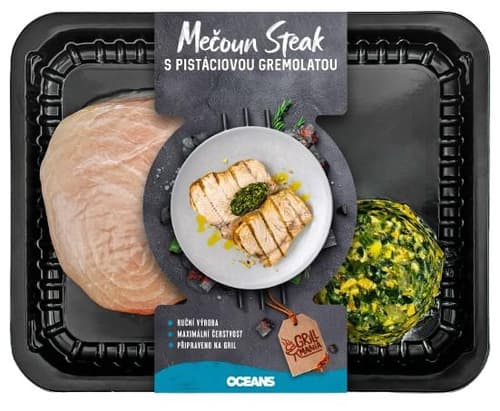 Dopřejte si kulinářský zážitek s masitým steakem z mečouna doplněným o jemně voňavou pistáciovou gremolátu, která podtrhne přirozenou chuť ryby. Steak je ideální na gril.