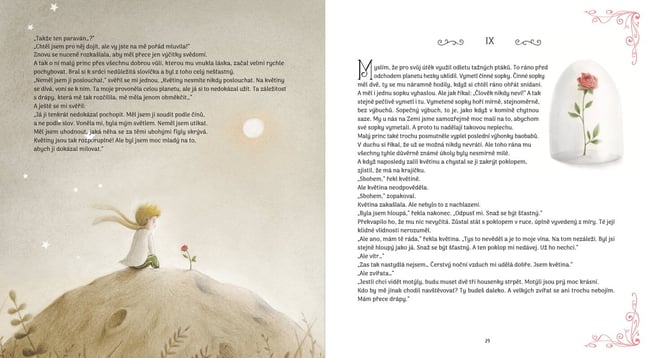 Malý princ je nadčasová pohádka Antoina de Saint-Exupéryho, která již po generace oslovuje děti i dospělé po celém světě. Vypráví příběh chlapce z jiné planety, jenž prostřednictvím svých cest objevuje hodnoty přátelství, lásky a zodpovědnosti. Učí nás vidět to podstatné srdcem, ne jen očima, a připomíná smysl života v jednoduchých, ale hlubokých obrazech. Tato kniha by neměla chybět v žádné rodinné knihovně.