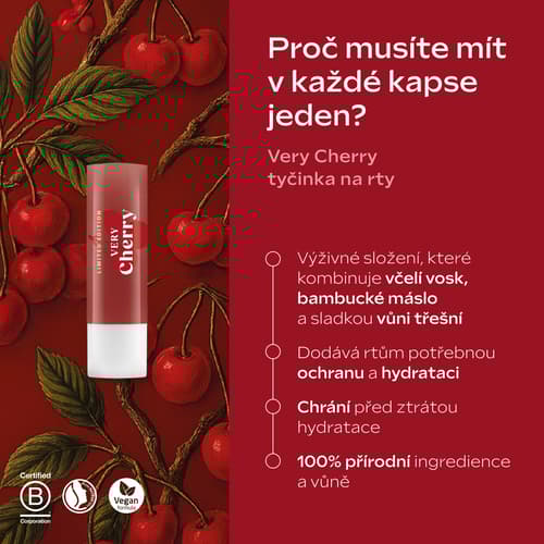 Very Cherry Lip Balm Care with a delicious cherry scent. A nourishing formula that combines beeswax, shea butter, and the sweet aroma of cherries, providing your lips with essential protection. It is ideal for daily use when you want to combine self-care with a pleasant experience. This balm delivers the necessary nourishment and protection for your lips, all with 100% natural ingredients. Key benefits: - Protects against moisture loss, keeping lips soft, supple, and pleasant to the touch. - Offers a protective, nourishing, and softening effect – for daily care that truly makes a difference. - The sweet, elegant, and playfully fruity cherry scent will captivate you from the very first whiff. - 100% natural composition – for a feeling of purity, safety, and natural beauty. - A gentle natural fragrance that delights the senses Dermatologically proven skin compatibility, making it suitable even for sensitive lips.