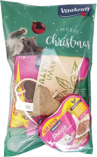 Vánoční balíček pro kočky s pochoutkami a hračkou, který potěší každou kočku pod vánočním stromečkem.