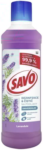 Savo dezinfekce a čistič na podlahy Levandule je univerzální přípravek, který je ideálním řešením pro každodenní účinnou dezinfekci a zároveň zajišťuje, aby váš dům a rodina byly chráněny před nečistotami a choroboplodnými zárodky. Přípravek neobsahuje chlór, takže je bez zápachu. Příjemná vůně levandule provoní celou vaši domácnost. Vůně je 100% biorozložitelná.