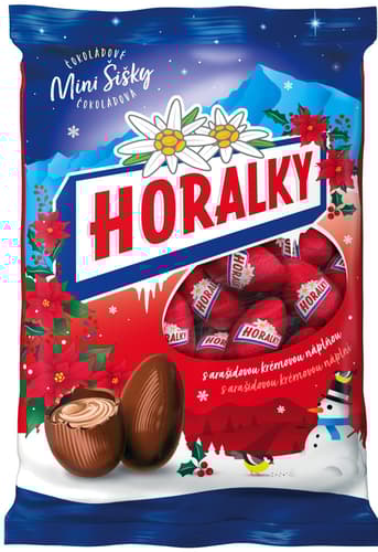 Mini šišky s příchutí Horalek jsou vyrobeny z mléčné čokolády s arašídovou krémovou náplní.
