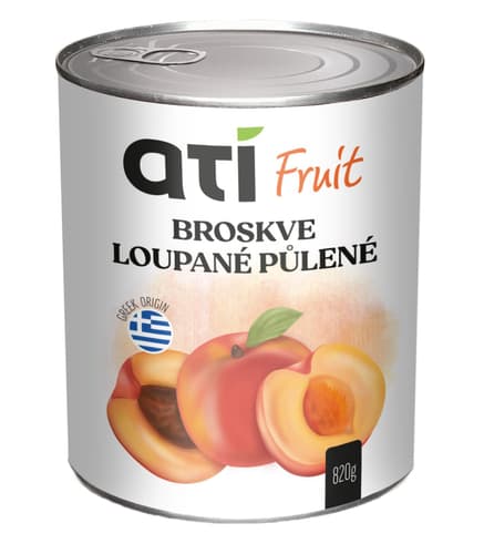 Broskve loupané, půlené v mírně sladkém nálevu.