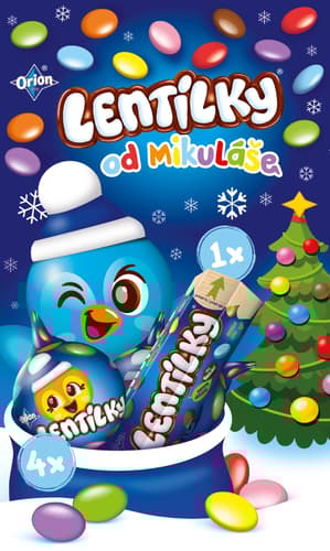 Udělejte radost svým blízkým mikulášským balíčkem Orion, který obsahuje Lentilky a 4 duté figurky z mléčné čokolády s Lentilkami uvnitř.