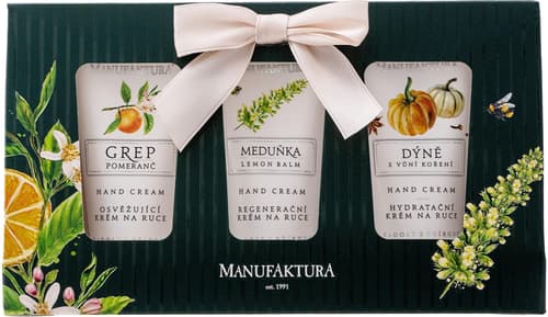 Dárková sada trio pečujících krémů na ruce v praktickém balení do kabelky nabídne ideální péči v zimních dnech – hydrataci, regeneraci i ochranu proti vysušení. Objevte pestrou paletu vůní – limitovanou edici Dýně s hřejivými podzimními tóny, svěží kombinaci Grepu & Pomeranče i relaxační Meduňku. Krémy obsahují až 98 % ingrediencí přírodního původu, rychle se vstřebávají, nádherně voní a jsou vhodné i pro vegany.