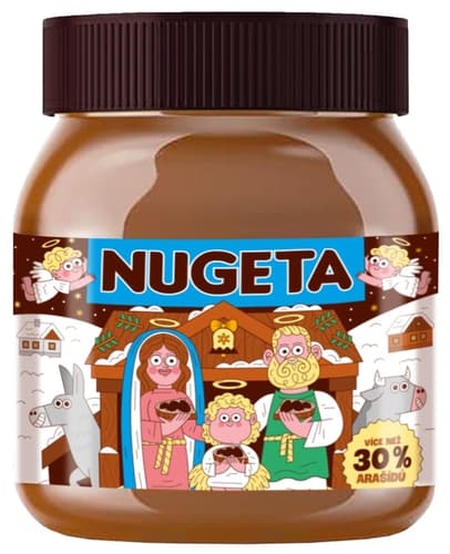 Sladká arašídová pomazánka značky Nugeta s vánočním designem. Pomazánka neobsahuje palmový olej.