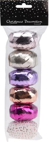 Barevná sada šesti dárkových stuh v jemných metalických odstínech růžové, fialové, zlaté, stříbrné a bílé s dekorem. Ideální pro ozdobné balení vánočních dárků, tvorbu mašlí či zdobení svátečních aranžmá. Lesklý povrch dodá každému balíčku elegantní a slavnostní vzhled.