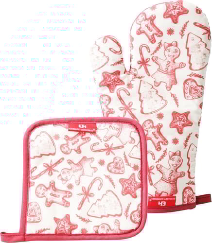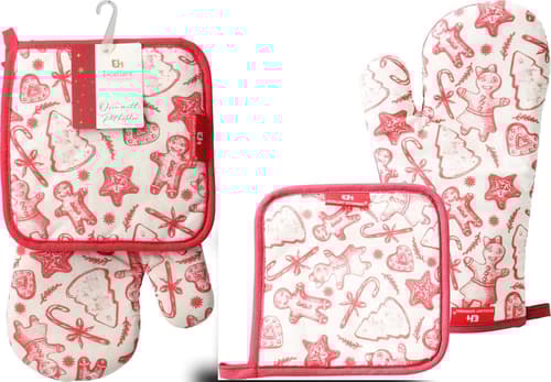 Praktická sada kuchyňské chňapky a podložky s veselým vánočním motivem perníčků a hvězdiček. Ideální doplněk pro vánoční pečení, který ochrání vaše ruce před horkem a zároveň ozdobí kuchyň sváteční atmosférou. Díky poutku lze chňapku i podložku snadno zavěsit a mít je vždy po ruce.
