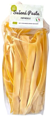 Sušené semolinové těstoviny pappardelle v BIO kvalitě. Těstoviny vznikají z prvotřídní semolinové mouky z oblasti Ravenny v Itálii – z tvrdé pšenice, která je základem kvalitní pasty. Těstoviny se tvarují pomocí bronzových matric, díky nimž mají hrubší povrch, který skvěle zachytí omáčku.