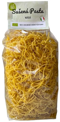 Sušené semolinové nudle v BIO kvalitě. Nudle vznikají z prvotřídní semolinové mouky z oblasti Ravenny v Itálii – z tvrdé pšenice, která je základem kvalitní pasty. Nudle se tvarují pomocí bronzových matric.
