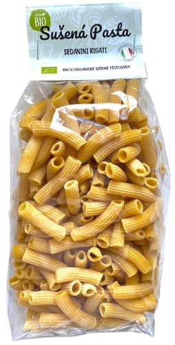 Sušené semolinové těstoviny sedanini rigati v BIO kvalitě. Těstoviny vznikají z prvotřídní semolinové mouky z oblasti Ravenny v Itálii – z tvrdé pšenice, která je základem kvalitní pasty. Těstoviny se tvarují pomocí bronzových matric, díky nimž mají hrubší povrch, který skvěle zachytí omáčku.