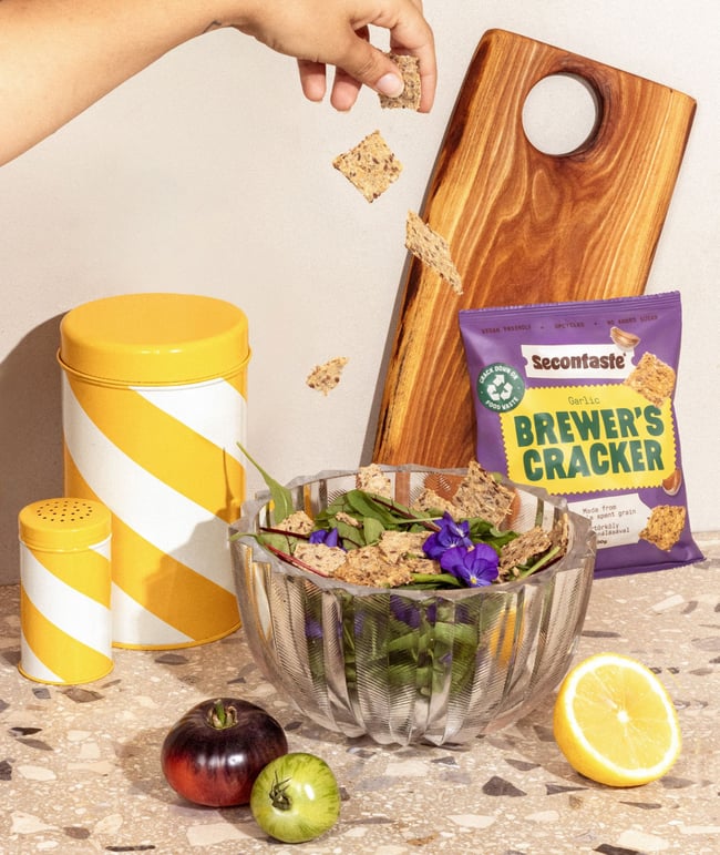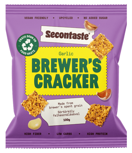 Křupavé krekry Secontaste Brewer's s příchutí česneku a pivovarským mlátem. Upcyklací pivovarského mláta se snižuje množství potravinového odpadu. Krekry jsou ideální i pro vegany, obsahují velké množství bílkovin a žádný přidaný cukr.