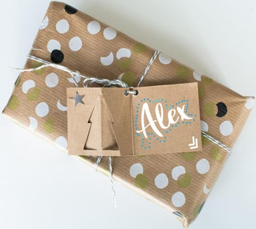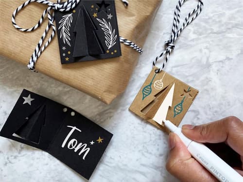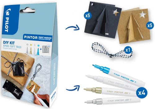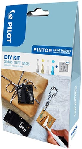 Kreativní sada deseti vánočních visaček na dárky a akrylových popisovačů Pilot Pintor ve vánočních barvách – zlatá, stříbrná, bílá a metalická modrá.