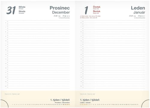 Otevřete diář na aktuální den pomocí odtrhávacího rožku. Zapisujte si denní úkoly, schůzky, poznámky či cíle. Díky přehlednému členění můžete snadno plánovat jednotlivé týdny i měsíce.