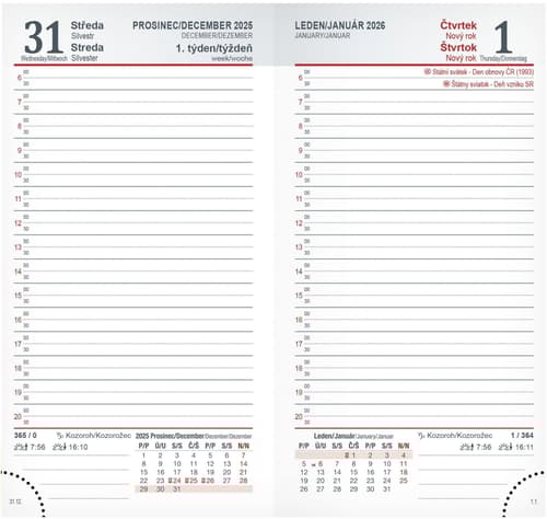 Otevřete diář na aktuální den pomocí odtrhávacího rožku. Zapisujte si denní úkoly, schůzky, poznámky či cíle. Díky přehlednému členění můžete snadno plánovat jednotlivé týdny i měsíce.