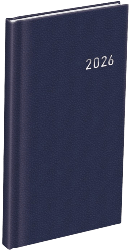 Týdenní diář na rok 2026 v tmavě modré barvě nabízí přehledné členění týdnů a elegantní design. Odolný PVC povrch chrání před poškozením, kompaktní rozměry 90 × 170 mm umožňují snadné nošení. Obsahuje československé týdenní kalendárium, prostor pro poznámky a mapy.