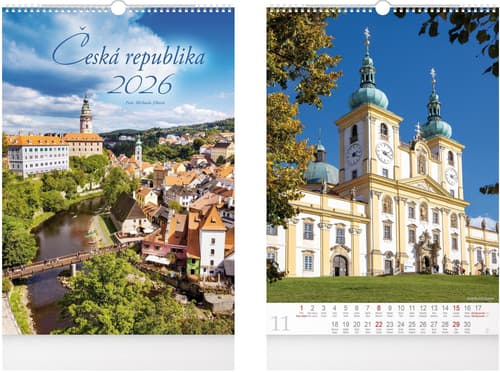 Nástěnný kalendář Česká republika 2026 zachycuje krásu českých měst, krajiny i památek na 14 listech s měsíčním kalendáriem.