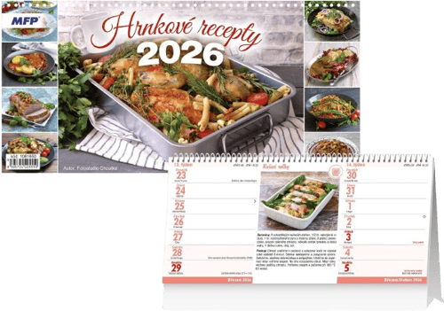 Stolní čtrnáctidenní kalendář Hrnkové recepty 2026 nabízí každý týden nový recept na chutný pokrm doplněný lákavou fotografií. Praktický pomocník pro plánování i inspiraci v kuchyni.