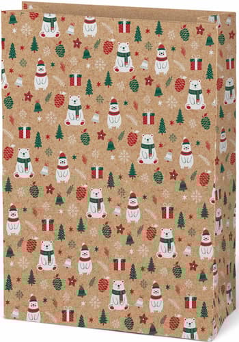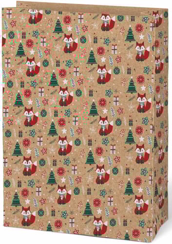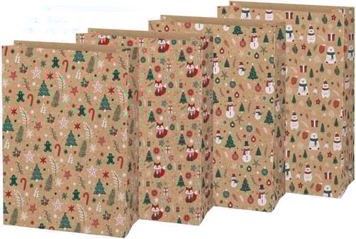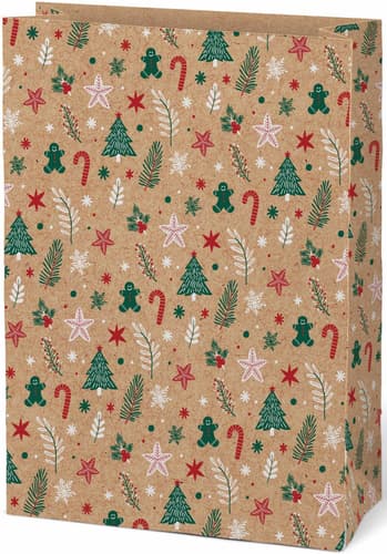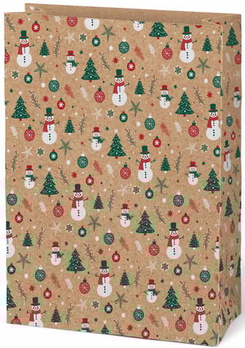 Vánoční papírový kraftový sáček o rozměru 26 × 36 × 12 cm s veselými svátečními motivy stromků, sněhuláků a hvězd. Ideální alternativa k balicímu papíru – praktická, ekologická a stylová.