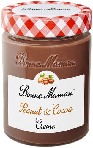 Bonne Maman arašídovo–kakaový krém. Arašídy a kakao, jemně zkombinované v krémové pomazánce. Jemně pražené arašídy, ty nejkvalitnější ingredience a spousta lásky. Jemné krémy Bonne Maman si získají srdce každého.